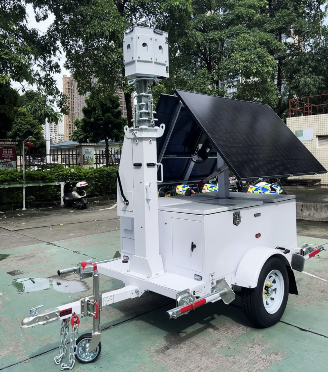 These trailers work well for large areas where a guard can’t see every corner from one post. They can cover entrances, fence lines, storage zones, and parking areas, giving managers a clearer view of what’s happening on site.
